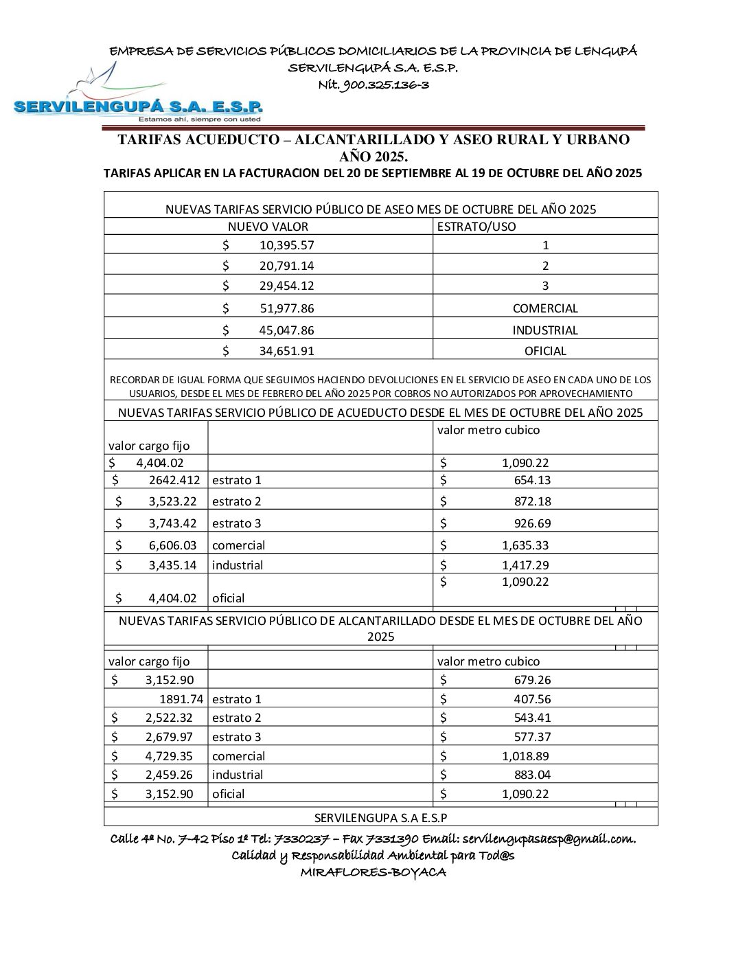TARIAS APLICAR FACTURACION 20 SEPTIEMBRE AL 19 DE OCTUBRE ACUEDUCTO – ALCANTARILLADO Y ASEO RURAL Y URBANO AÑO 2025.